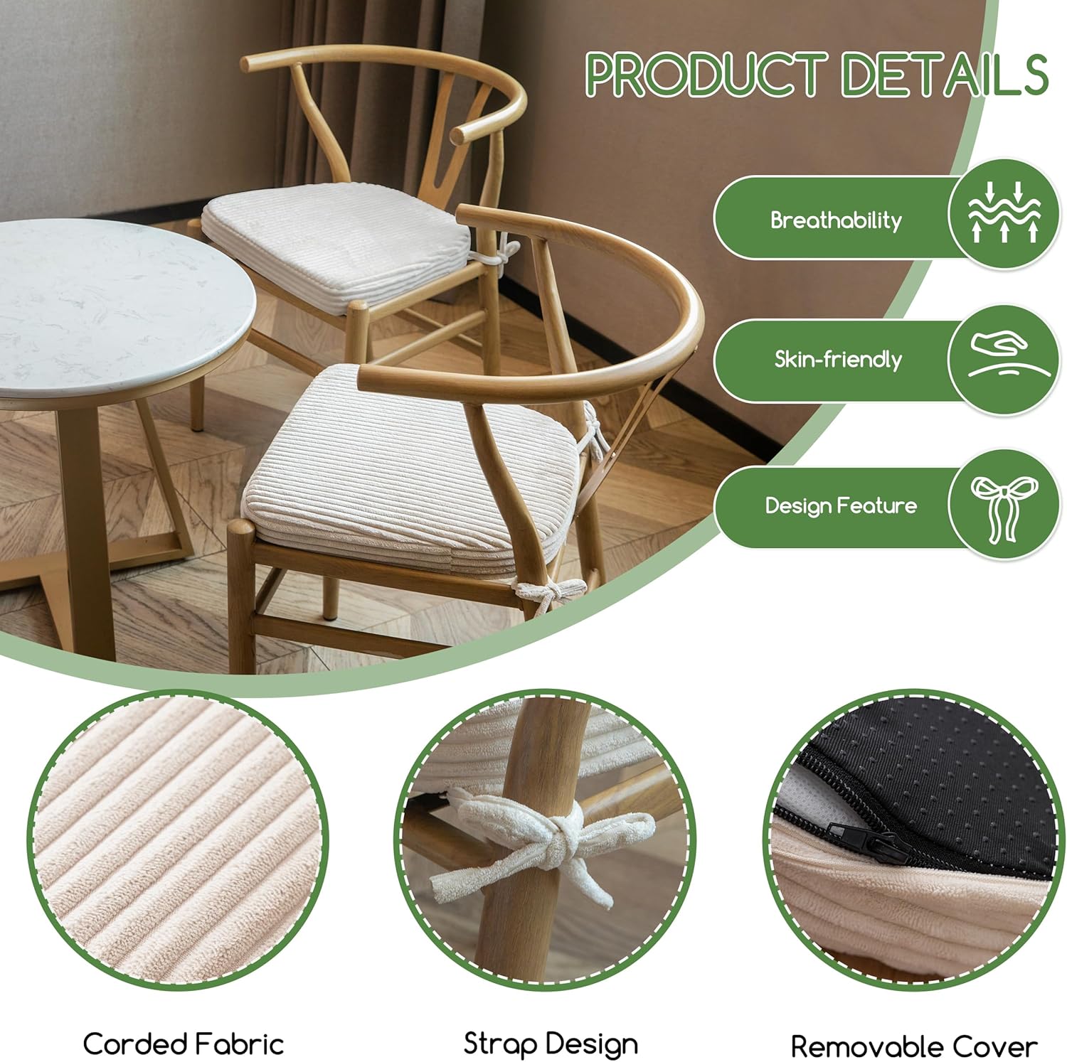 Secure Tie Straps: Corner ties help fasten the cushion in place, ensuring it doesn’t shift or fall off when seated.