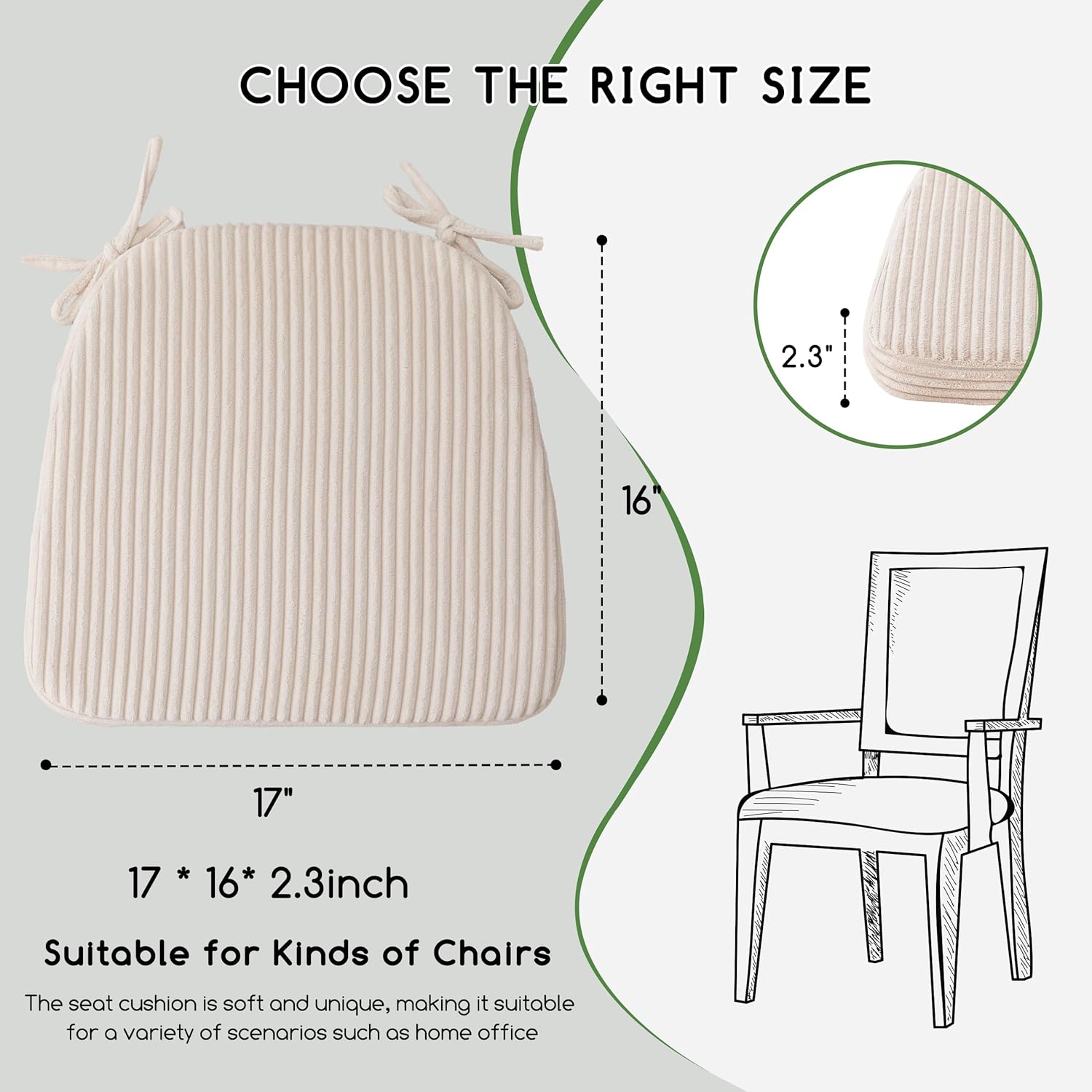 Striped Fabric Chair Cushion with Ties – Beige Soft Pad for Dining, Office, Home Chairs, 17 x 16 x 2.3 inch